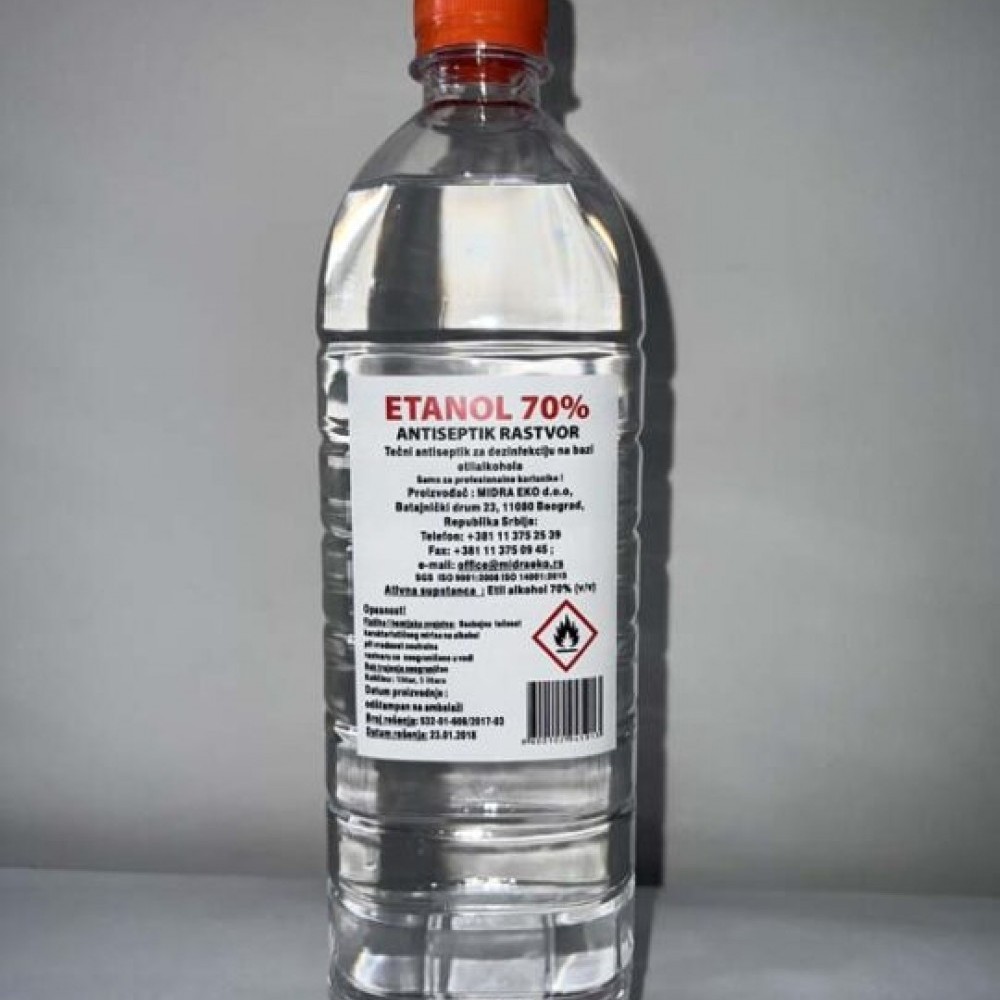 ETANOL 70% V/V DEZINFEKCIONI RASTVOR se koristi za za dezinfekciju površina i opreme u objektima javnog zdravlja (klinikama, bolnicama, domovima zdravlja, ambulantama, gerontološkim centrima), javnim objektima i ustanovama (škole, vrtići, fakulteti), javnom prevozu, prehrambenoj industriji (mlekare, uljare, šećerane, mlinsko-pekarska industrija, industrija mesa, jaja, voćarstvo i povrtarstvo, konditorska industrija, industrija skroba i glutena, proizvodnja pečuraka, proizvodnja slada i dr.) i ugostiteljstvu (hoteli, moteli, restorani, kuhinje, restorani društvene ishrane).